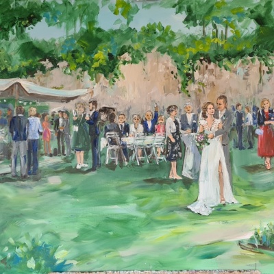 2. Bespreek je wensen: We bespreken samen wat je graag op het schilderij wilt laten zien, zodat het perfect aansluit bij jullie wensen.